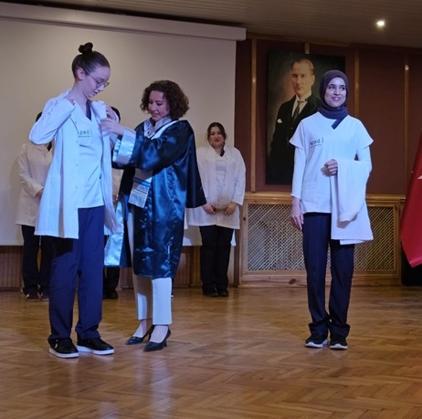 During the ceremony, Dr. Serap Öner from Fırat University delivered a talk titled “The First Step into the Profession: The Meaning of the White Coat and Fetoscope.” In her speech, she emphasized that the white coat symbolizes professional identity and ethical responsibility, while the fetoscope is an essential tool for listening to the earliest signs of life and monitoring maternal and fetal health. Following the talk, faculty members dressed the students in their white coats and presented them with their fetoscopes.